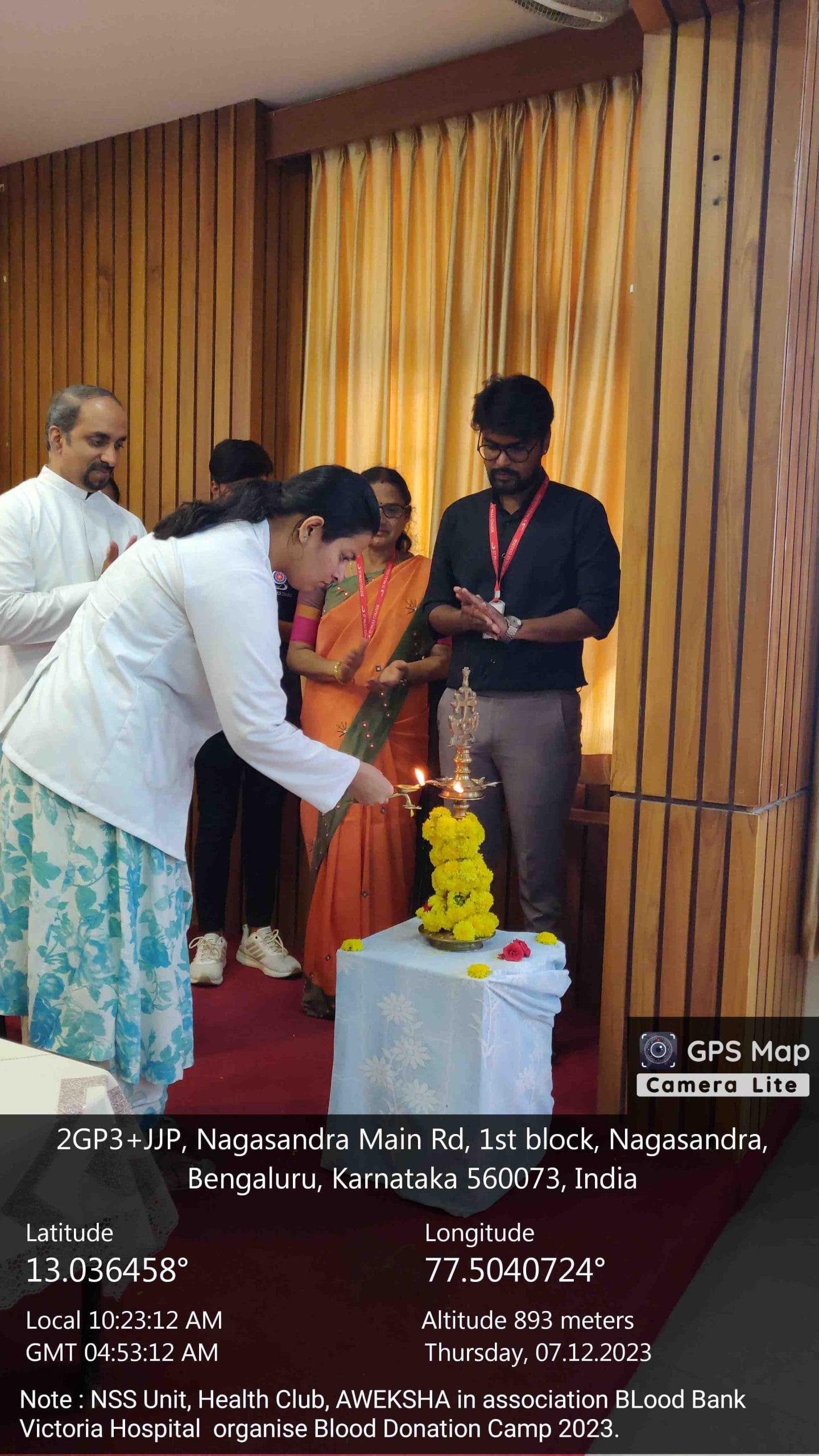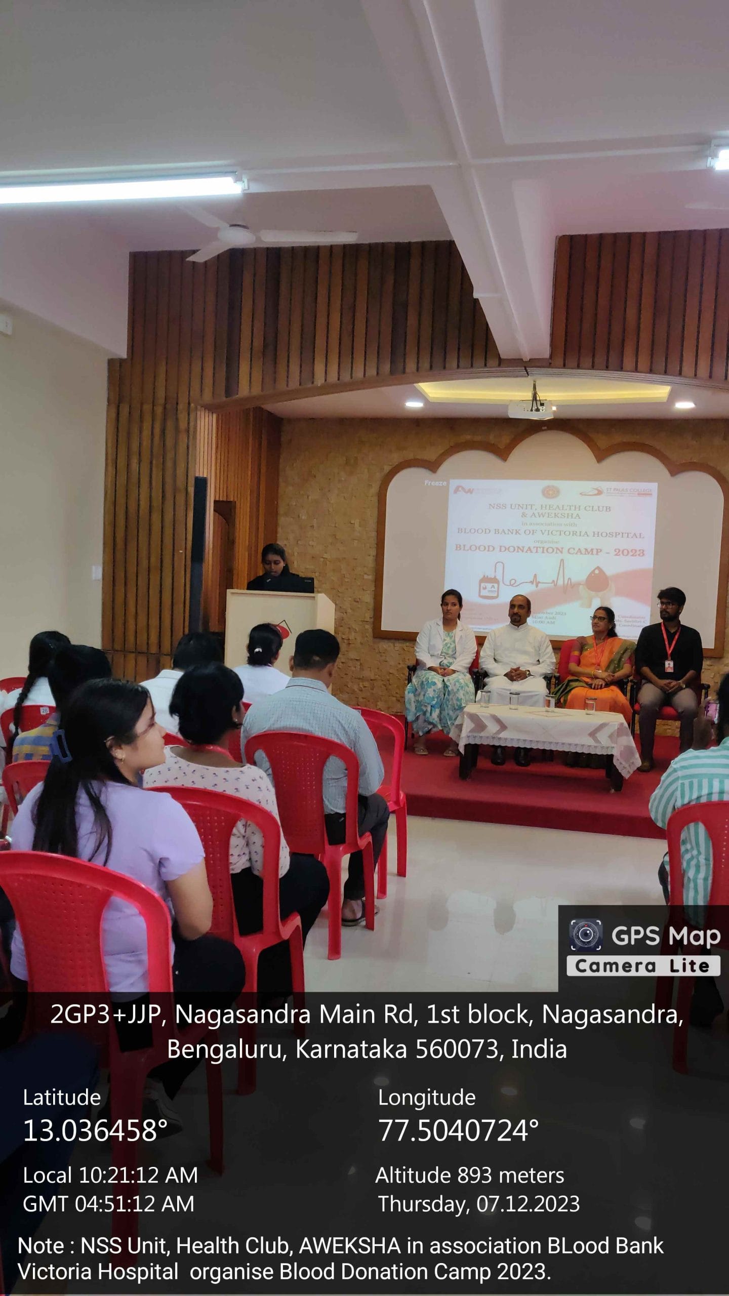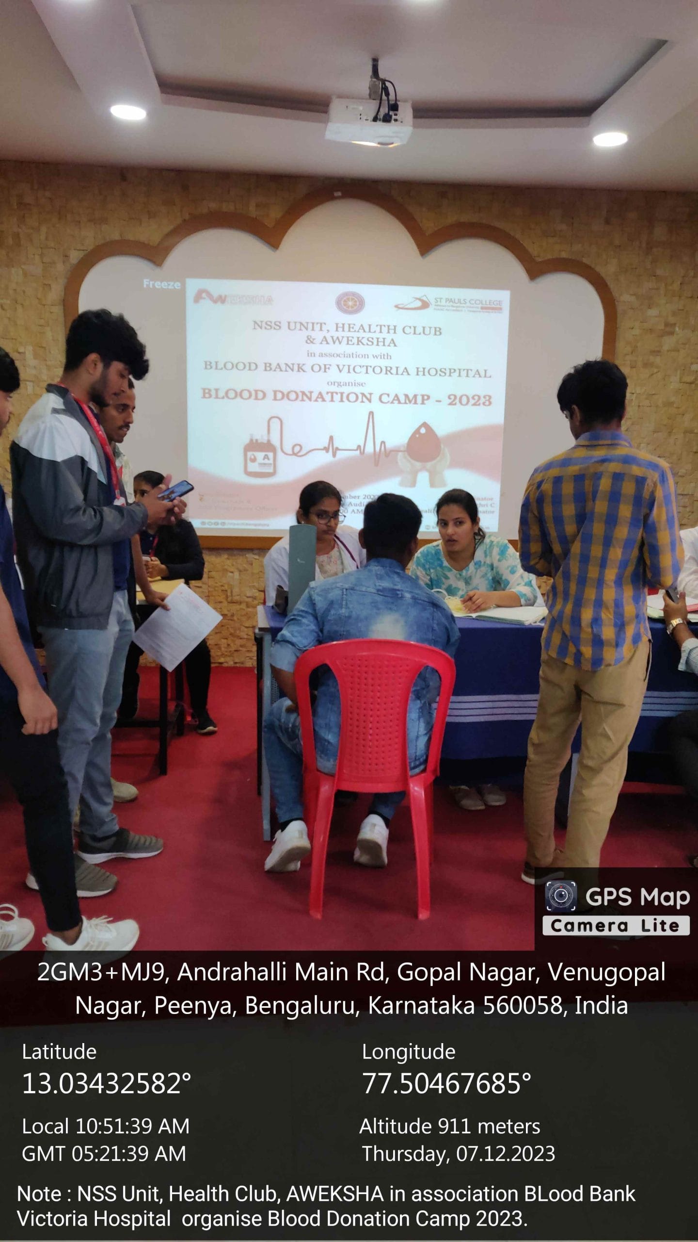 NSS Unit, Health Club & AWEKSHA in association with Blood Bank of Victoria Hospital organised Blood Donation Camp 2023 on 7 December 2023. Dr. Akshatha, Victoria Hospital, Fr. Dr. Thomas M J, Principal, Mr. Gowtham R, NSS Programme Officer, and Ms. Savitrhi C, Health Club Coordinator shared the dais during the inaugural ceremony. The fraternity of Faculty and Students has donated blood to give the right meaning to the objective of the camp, in life-saving through the donation of blood. 57 Units of blood were donated to Blood Bank.