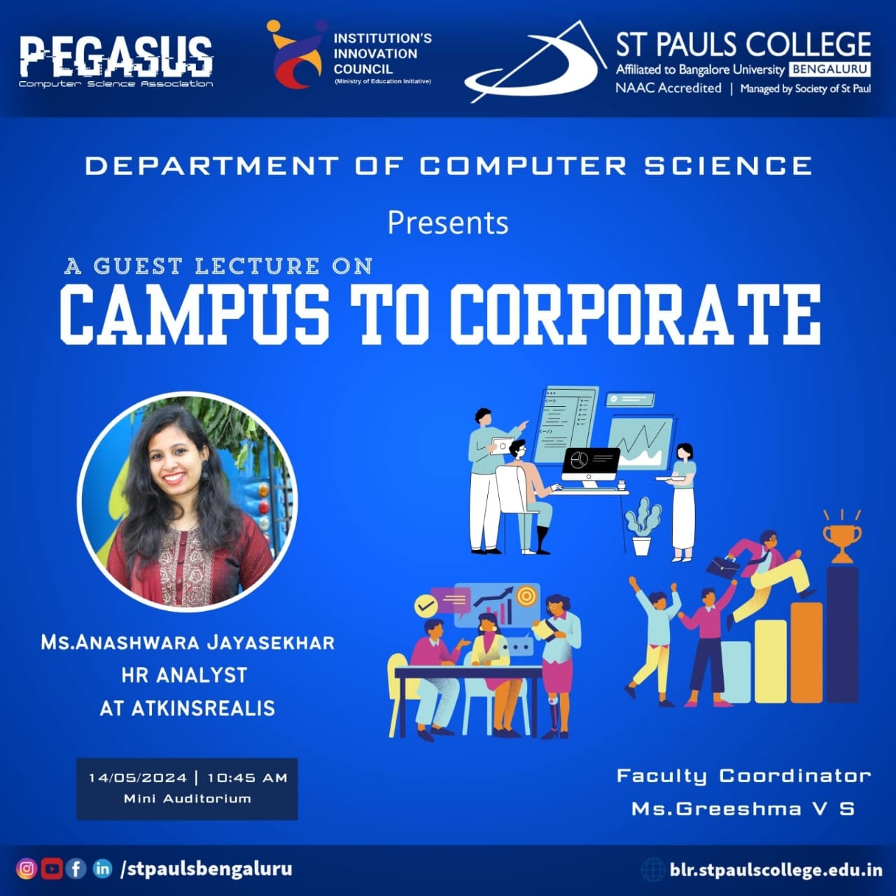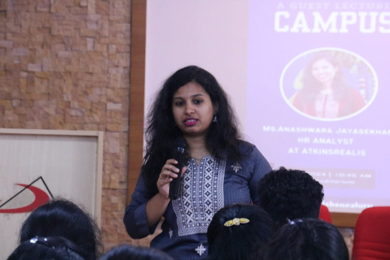 The Department of Computer Science recently hosted a guest lecture titled “From Campus to Corporate,” designed to prepare final-year students for their impending transition from academic life to professional careers. This event attracted 110 enthusiastic participants from various disciplines, including BCA, B.Sc, B.Com, BBA, and BA. The speaker for the session was Ms. Anashwara J, an experienced HR Analyst at Atkinsrealis, who shared her professional insights and personal experiences.