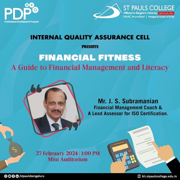 The Internal Quality Assurance Cell (IQAC) successfully conducted a one-day Professional Development Programme (PDP) on the theme of “Financial Fitness: A guide to financial management and literacy ” on the 27th of February 2024. The event aimed to equip participants with essential knowledge and skills related to financial management and well-being.
